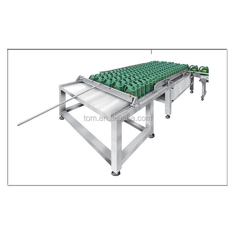 Η πλατφόρμα είναι κατασκευασμένη από SS304, μήκος: 3000mm, πλάτος: 1700mm, ύψος: 1100mm, ο εργαζόμενος έβαλε το άδειο πακέτο κονίστρου σε αυτή την πλατφόρμα και σκίτσο πακέτο δάκρυα,τότε τα άδεια δοχεία θα εισέλθουν στον μεταφορέα αυτόματα, και περιμένετε στο σταθμό ανεφοδιασμού.